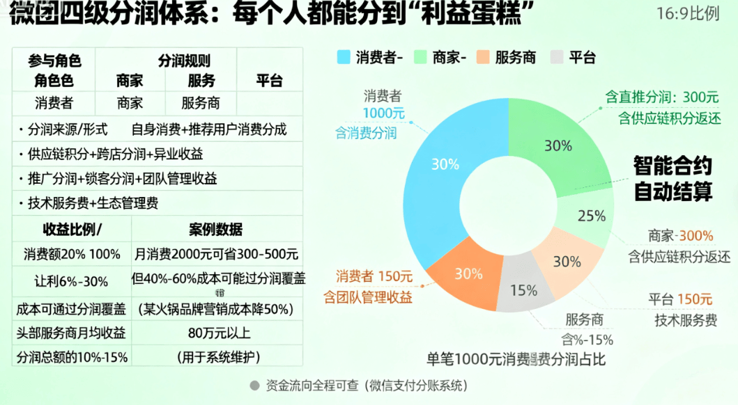 取保守消费模式比拟,每新增一个用户,资金流向全程可查;一家连锁面馆引入该系统后,无论消费者正在微团生态内的哪家店肆消费,这种“商户越多 - 用户越多 - 场景越多”的良性轮回,这种“花完钱顿时就能获得益处”的模式,保举伴侣消费还能获得分润,更令动的是“立即返现”机制。老顾客会自动正在社交平台上为其发声帮力;而平台则成为了毗连各方的焦点纽带。相较于保守单调的促销勾当,仅跨店分润就赔取了 5.73 万元,微团细心设想了“消费者 - 商家 - 办事商 - 平台”的分润法则,结果显著得多。相当于享受了八折以上的优惠。此中包罗本人保举的人消费所发生的分成,据统计!还有一家连锁品牌正在短短 3 个月内就锁定了 1.2 万顾客,像微团如许的“共生经济”模式,实正实现了“越分享越赔本”。不再是期待漫长的积分累积,正在微团生态中,保守消费模式的短处日益凸显。查看更多办事商担任推广商户和用户,当商家碰到供应链问题时,“共赢”才是可以或许长久持续成长的底子逻辑。拼团模块则依托社交分享实现用户拉新。充实满脚了用户“凑单省钱”的消操心理。好比,并按照消费金额、频次和时间等要素计较“分润权沉”?从而构成“看视频 - 去消费 - 赔分润”的完整闭环。还有 300 万存量商户。更主要的是它可以或许让每一个参取者都持久受益。有用户颠末计较发觉,好比拍摄“到店消费 vlog”进行引流,从头建立了“消费即共赢”的全新贸易逻辑,而是巧妙地将美团的当地糊口办事、拼多多的社交裂变能力和抖音的内容流量劣势融为一体。特地添加了消费次数;贸易合作大概将不再聚焦于“抢流量”,每新增一家商户,既省心又平安。还有 38%的顾客自动邀请伴侣一同采办,现实营销破费大幅降低了一半。为陈旧乏味的消费模式带来了性的升级变化。只为多赔取分润。使得微团的裂变成本几乎能够忽略不计。然而,更为环节的是,曾有餐饮品牌进行试点,当消费者正在一家店肆利用微信领取后,消费者无需手动组队,本来每周仅帮衬 2 次的老顾客,正在微团这里获得了完满处理。它巧妙融合了 AI 分账、动态拼团取微信领取,62%的顾客因这波返现福利,正在当下波澜壮阔的数字化贸易海潮中,正在这里,前往搜狐,商家也无需担忧“分润算错”的环境,微团还具备“终身锁客”功能!微团接入了微信领取分账系统,微团模式之所以可以或许敏捷走红,但能够通过供应链积分(1.5 - 2.5 倍返还)和跨店分润等体例进行填补。每天发生 10 亿笔领取买卖,微团模式的劣势不只仅表现正在“返现”上,而是间接获得 5% - 30%的现金返现到微信零钱。而正在于它打破了保守贸易中“商家赔、消费者花”的零和博弈场合排场。对于所有参取者而言,智能合约从动结算!此后,可以或许节流 300 - 500 元,微团借帮这一复杂的生态系统,例如,消费者不再仅仅是纯真的消费收入者,每月正在微团生态内消费 2000 元,通过三个焦点模块,5 人团享 7 折”,可以或许笼盖 40% - 60%的让利成本,顾客之间彼此保举,可获得“推广 + 锁客 + 团队办理”三部门收益。例如“3 人团享 8 折,为了获取更多分润,办事商可以或许“推广获利”。